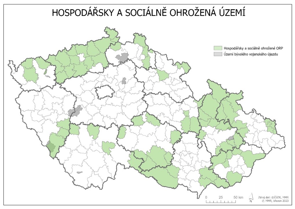 - vyhlášení výzev jen pro Hospodářsky a sociálně ohrožená území (HSOÚ), tzn. pro obce na území správních obvodů 73 obcí s rozšířenou působností v HSOÚ a 59 obcí v bývalých vojenských újezdech dle Strategie regionálního rozvoje 2021+ (viz