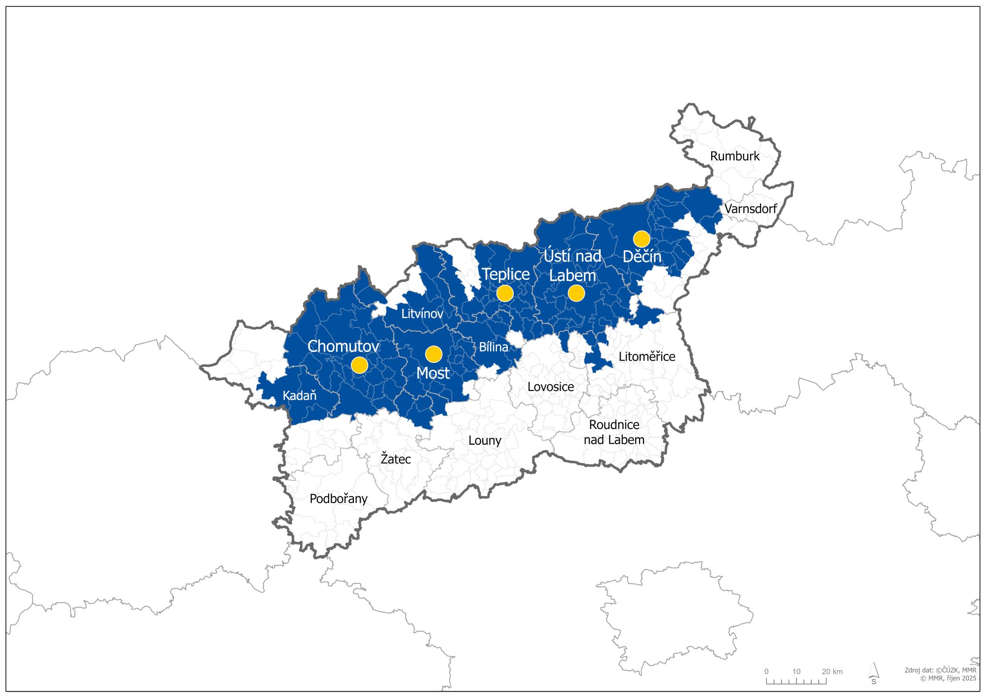- Jádrová města: Děčín, Ústí nad Labem, Teplice, Most, Chomutov